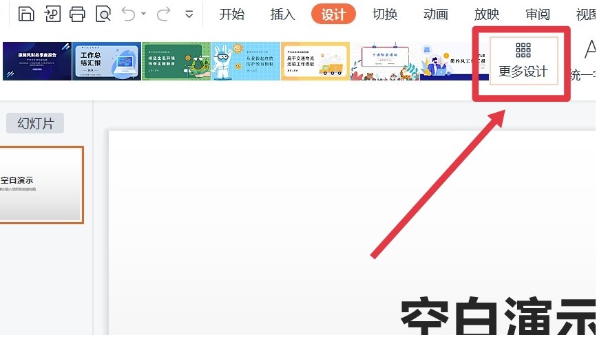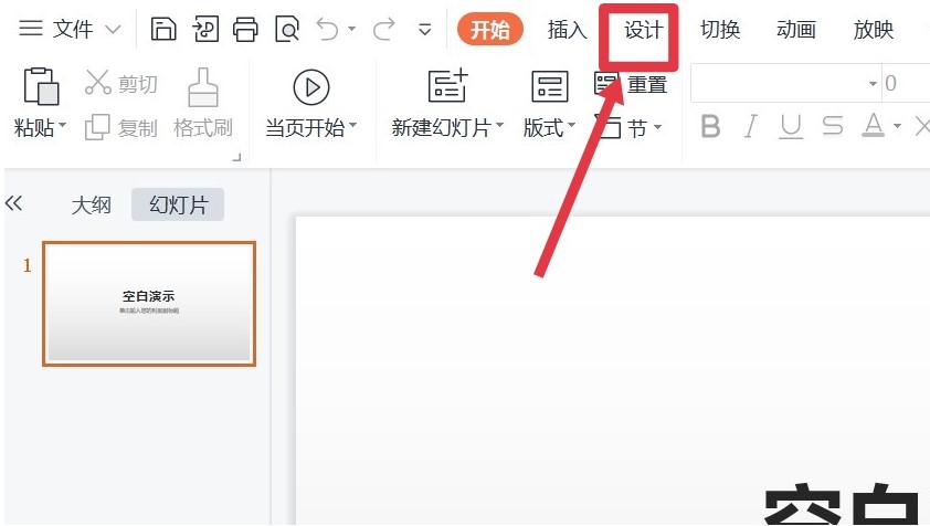 打开PPT页面,点击上方菜单栏中的“设计”。