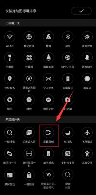 按住显示的所有图标中的“屏幕录制”,并将其拖到启用的开关上。