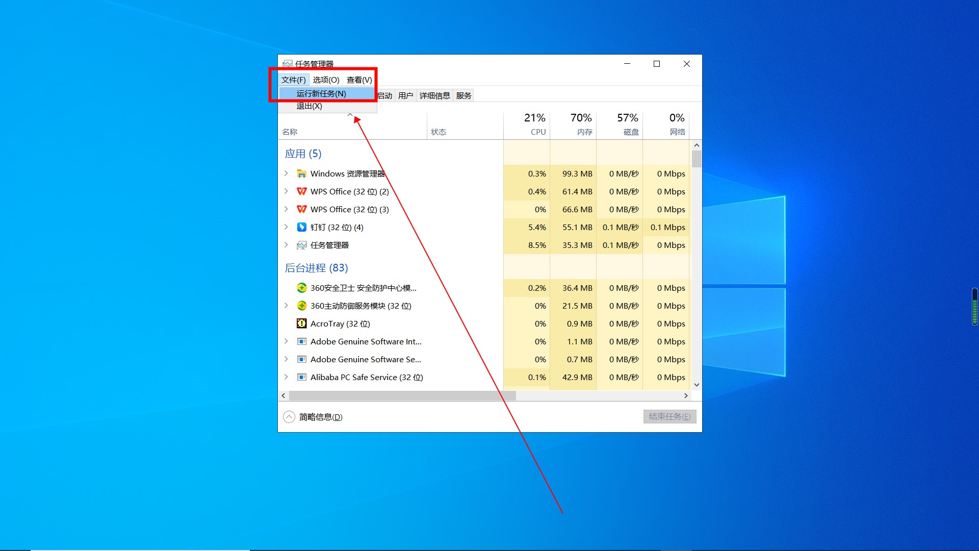 在任务管理器窗口中,单击“文件”下的“运行新任务”。