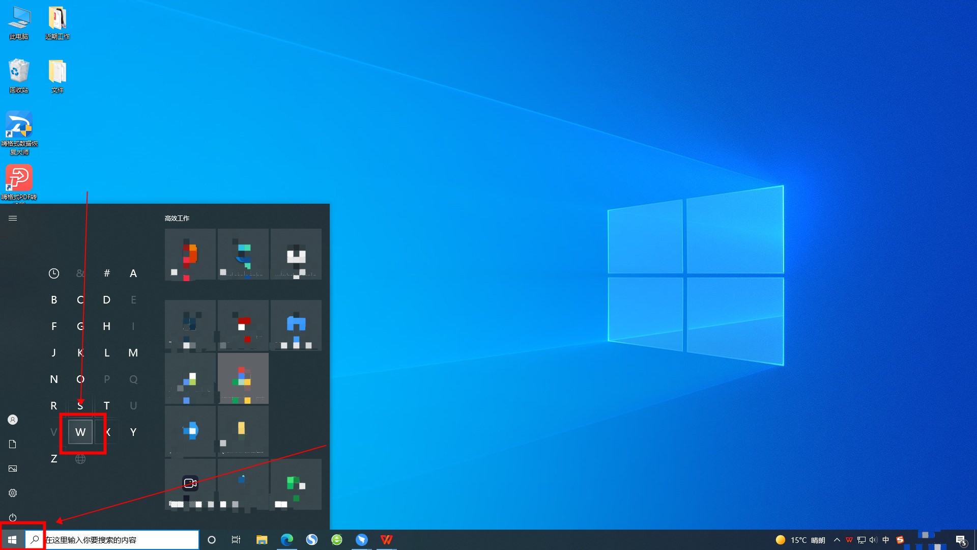 首先点击电脑左下角的“开始”,选择申请字母“W”。