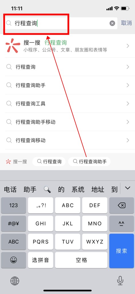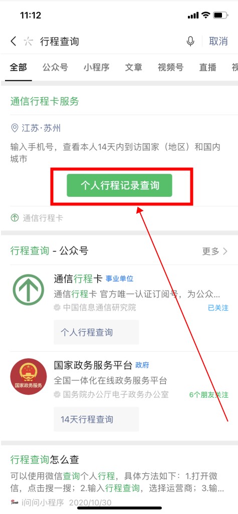 打开手机微信,在微信中搜索“行程查询”。在通信旅行卡服务中,点击“个人旅行记录查询”。进入通讯行程卡界面,自动识别要查询的内容。选中同意,然后单击查询。这样你就可以查看自己前14天内的个人行动轨迹。