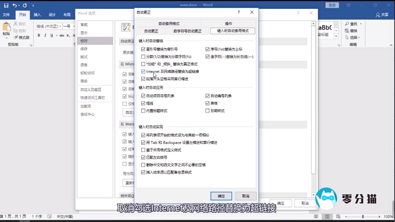 2.然后点击自动更正选项,在弹出的界面中找到输入时自动应用的格式。取消选中Internet和网络路径,并将其替换为超链接。