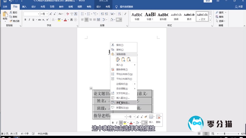 2.然后插入适当的表格并输入内容。选择表格右键选择表格属性,在弹出窗口中选择边框和底纹,选择无移除所有边框。
