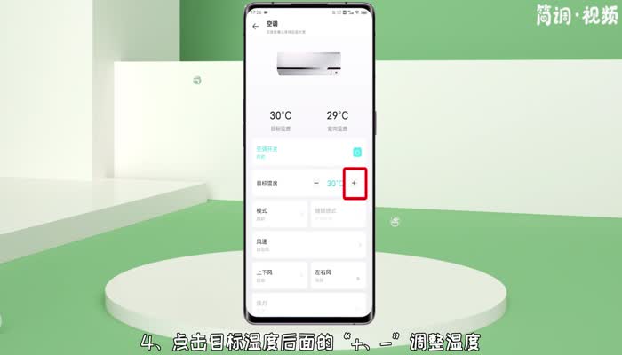 4.点击目标温度后面的“,-”调整温度,点击“模式”调整空调运行模式;