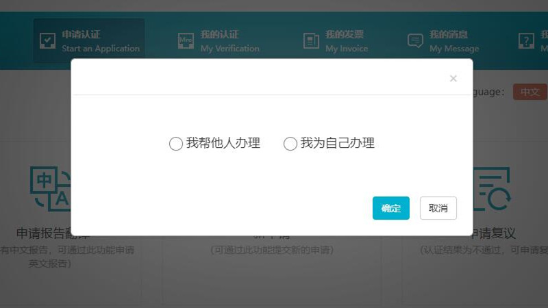 在弹出窗口中选择“我为别人办理”或“我为自己办理”选项并确认。