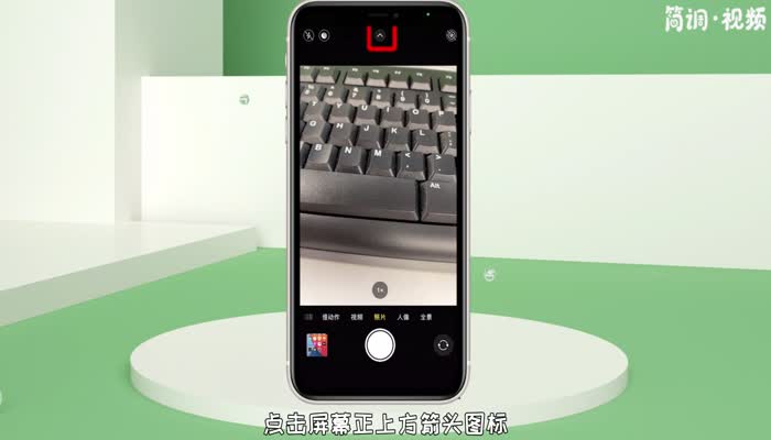 2.打开手机摄像头后,点击屏幕上方的箭头图标,打开下面的选项;