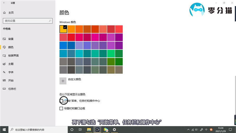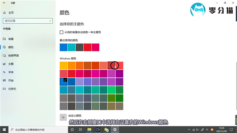 2.单击左侧窗口中的“颜色”,然后在右侧窗口中选择您喜欢的Windows颜色。