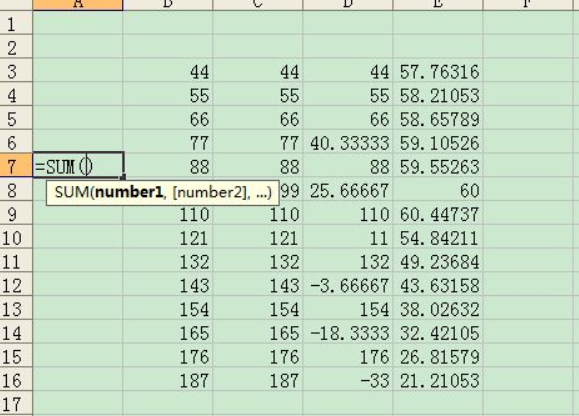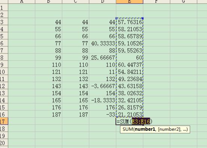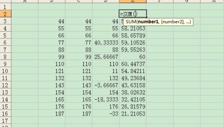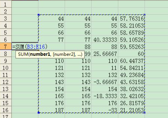 2.当求和位置在一组数据下方时,输入“ALT=”,求和函数将自动进入单元格,上方的一组数据将自动被选入求和范围。如果要求的范围并不是上述组的全部,该范围可以调整。