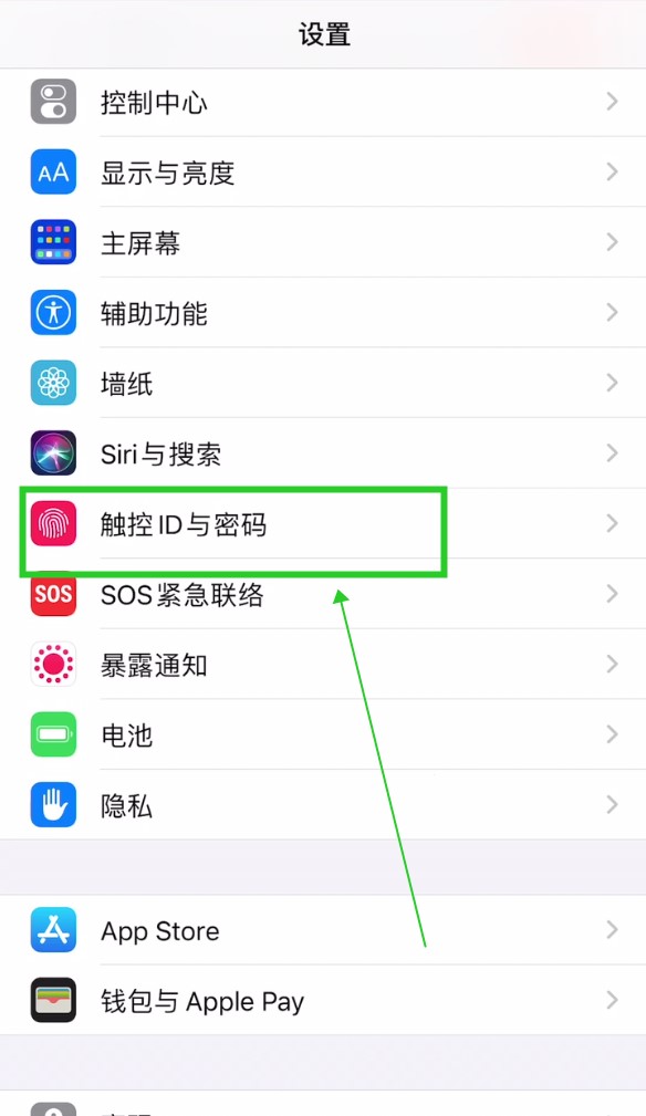 在设置中,下拉找到并点击“触控ID和密码”。
