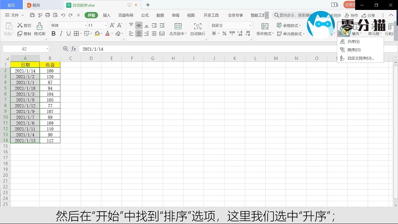 然后在“开始”中找到“排序”选项,这里我们勾选“升序”;