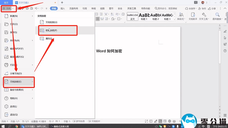 首先打开我们要加密的文档,点击左上角的文件,选择文档加密,点击密码加密。