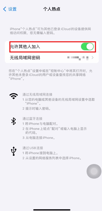 在这里,打开“允许其他人加入”按钮,热点就打开了,其他设备可以连接到这个热点。