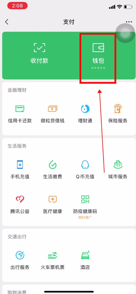 在支付中,点击顶部的“钱包”。