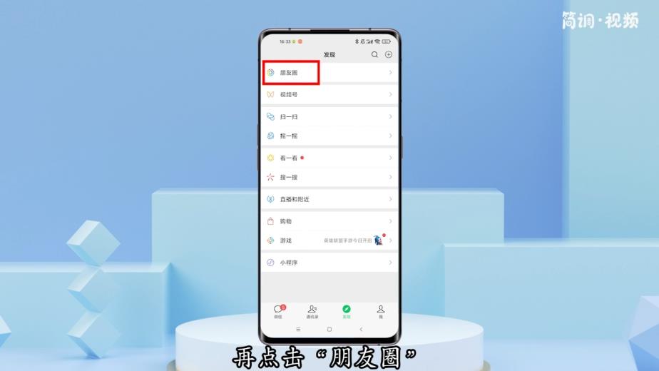 1.打开微信,在页面点击“发现”,然后点击“朋友圈”进入朋友圈界面;