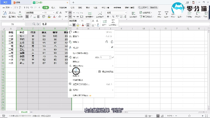 3.“列宽”也一样。选择要设置的列,点击鼠标右键选择“列宽”。