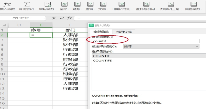2.“插入函数”对话框将立即弹出。选择单台机器上的所有函数,然后输入countif函数计算匹配单元格的个数。