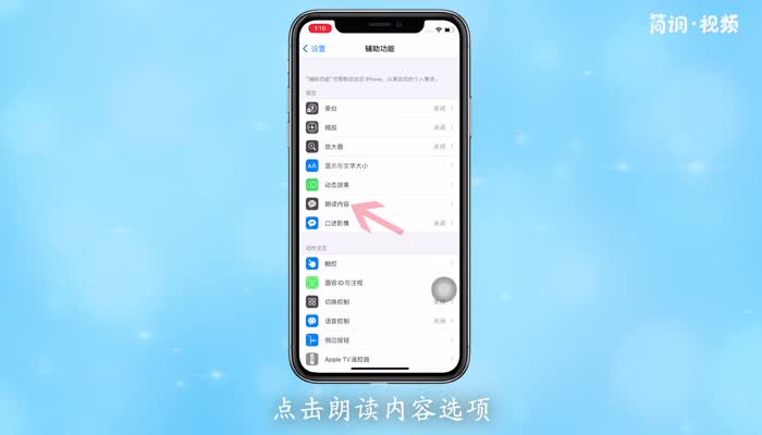 2.进入辅助功能页面后,点击“朗读”选项。页面跳转后,点击“朗读”选项后面的按钮打开;