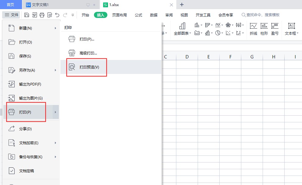 在文件下拉菜单中,点击“打印”,选择“打印预览”。