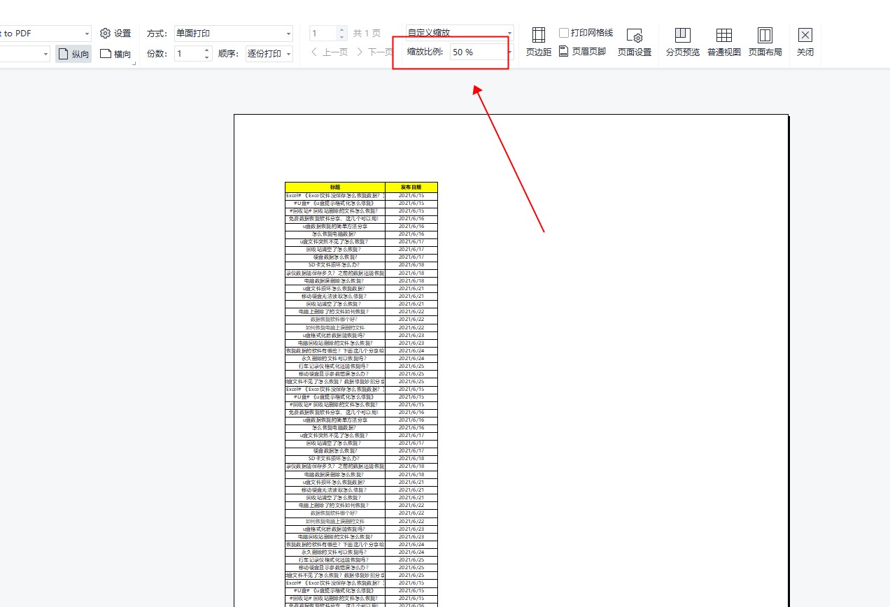 进入“打印预览”后,可以看到表格内容无法完整显示。单击上面的“缩放”进行调整,直到要打印的内容在一页中。