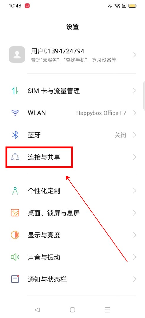 在手机设置中,点击“连接和共享”功能。