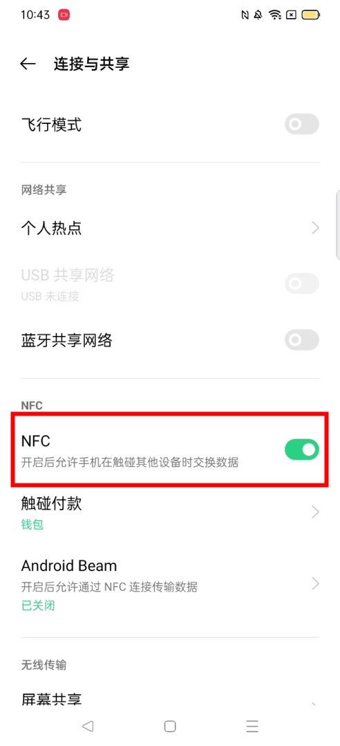 进入连接和共享页面,打开“NFC”功能。
