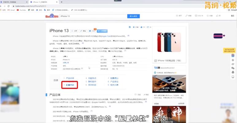 4.页面跳转后,点击目录中的“配置参数”选项,来到配置参数页面,可以查看iphone 13的具体配置参数。