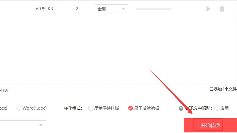 进入后,添加需要删除多余页面的PDF文件,点击右下角的“开始转换”按钮。