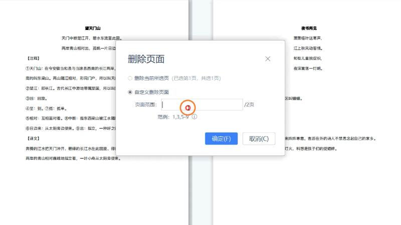 以自定义删除页面为例,输入页码,点击确定完成。