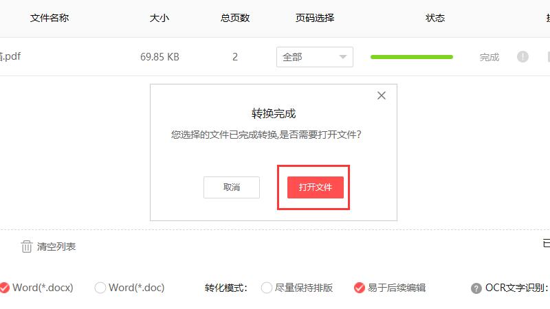 转换完成后,点击“打开文件”按钮打开Word文件。
