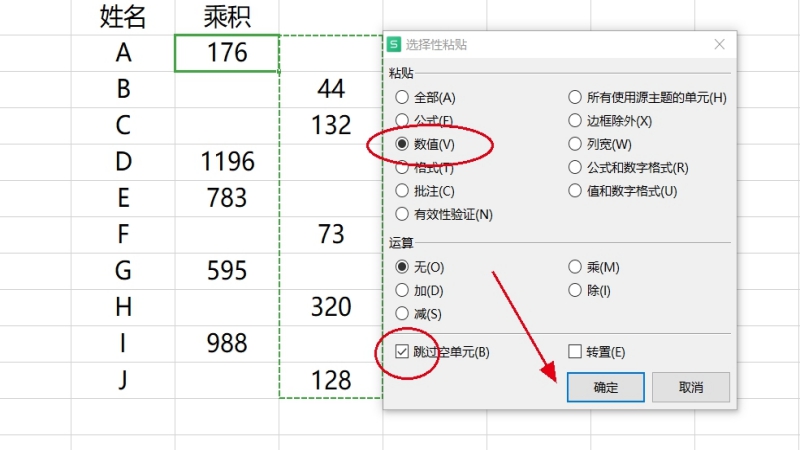 3.在弹出的“选择性粘贴”工具栏中,选中底部的“跳过单元格”,然后单击“确定”选项。