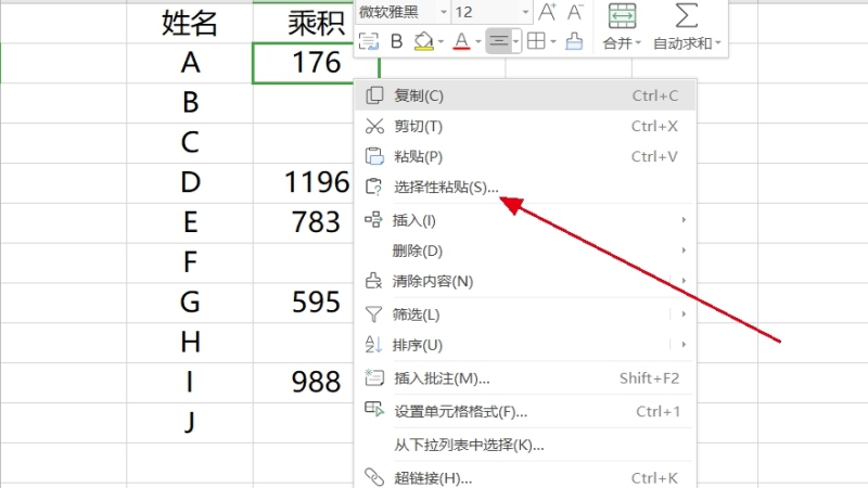 2.在数据选项的第二列中,单击第一个数据单元格,右键选择“选择性粘贴”。