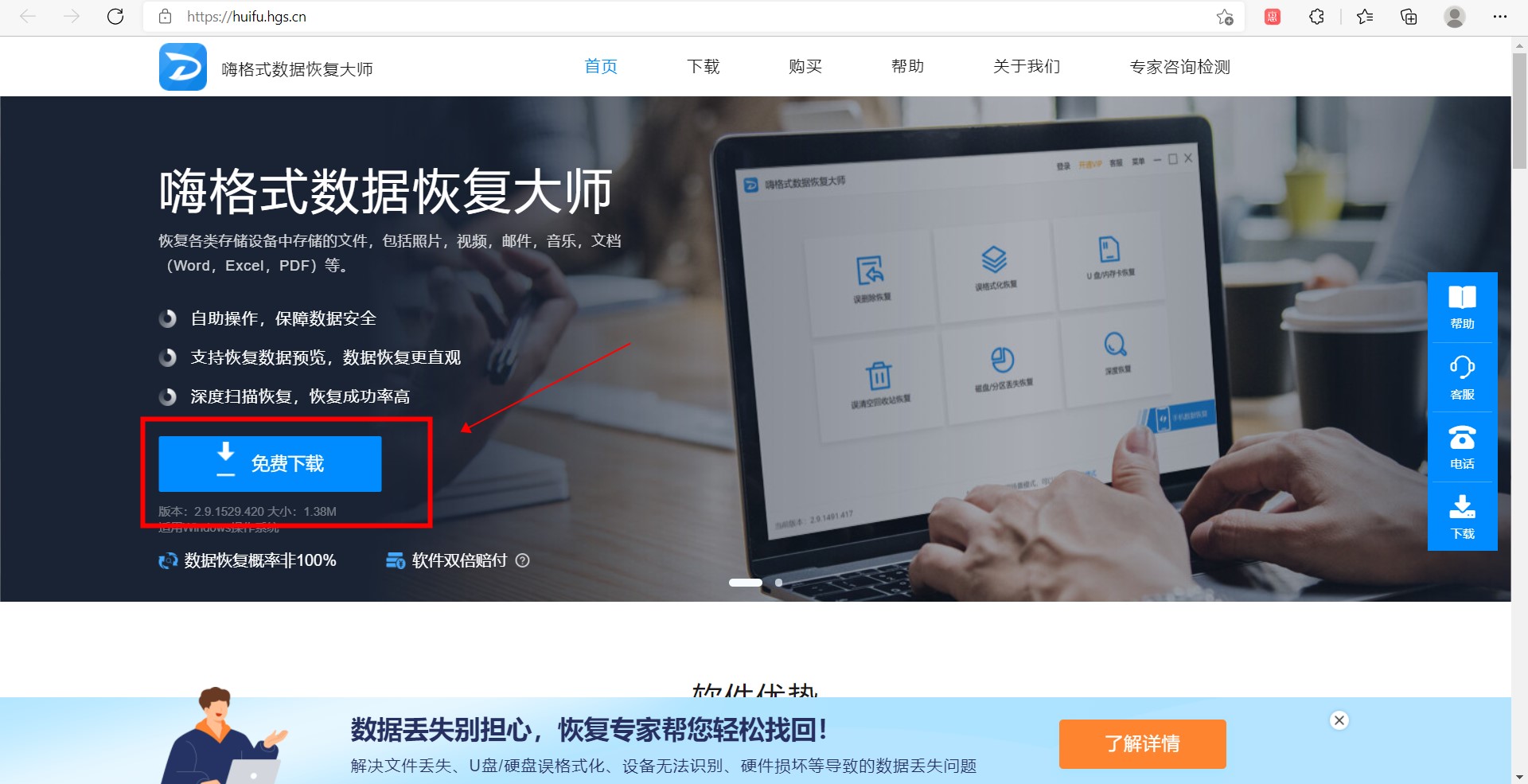 以在电脑中安装Hi格式数据恢复主软件为例。首先进入Hi格式数据恢复大师官网,点击“免费下载”。
