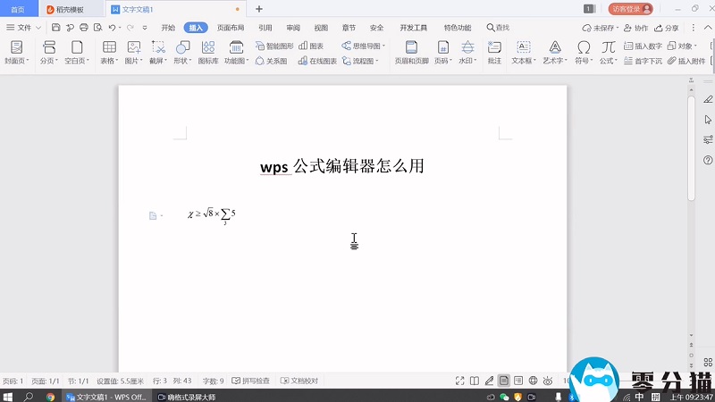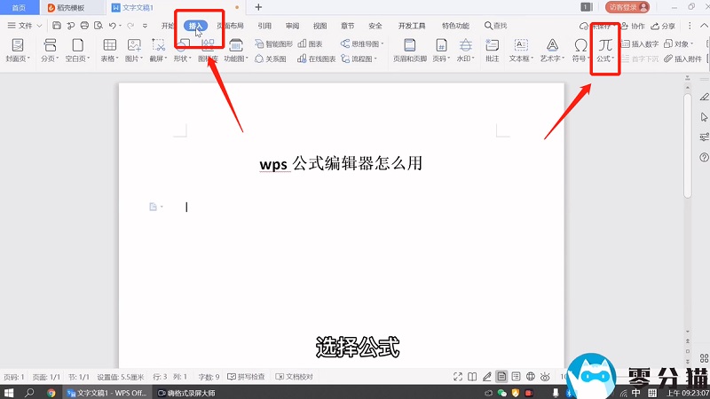 首先,打开一个文档,单击菜单栏中的插入,然后选择公式。