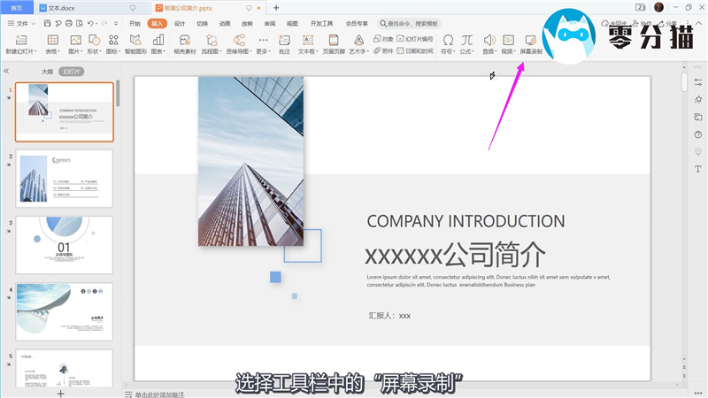 1.首先打开一个PPT文件,然后点击上面的“插入”,选择“屏幕录制”。