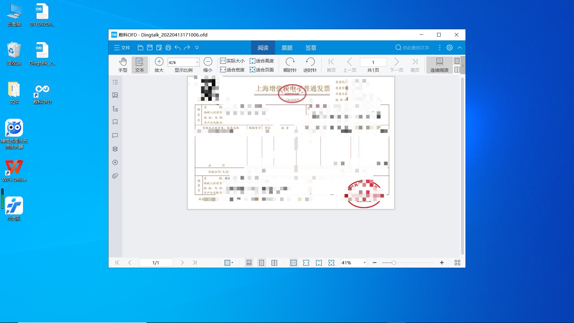 软件版本:WPS11.1.0.11365,数字OFD阅读器5.0.22.1812