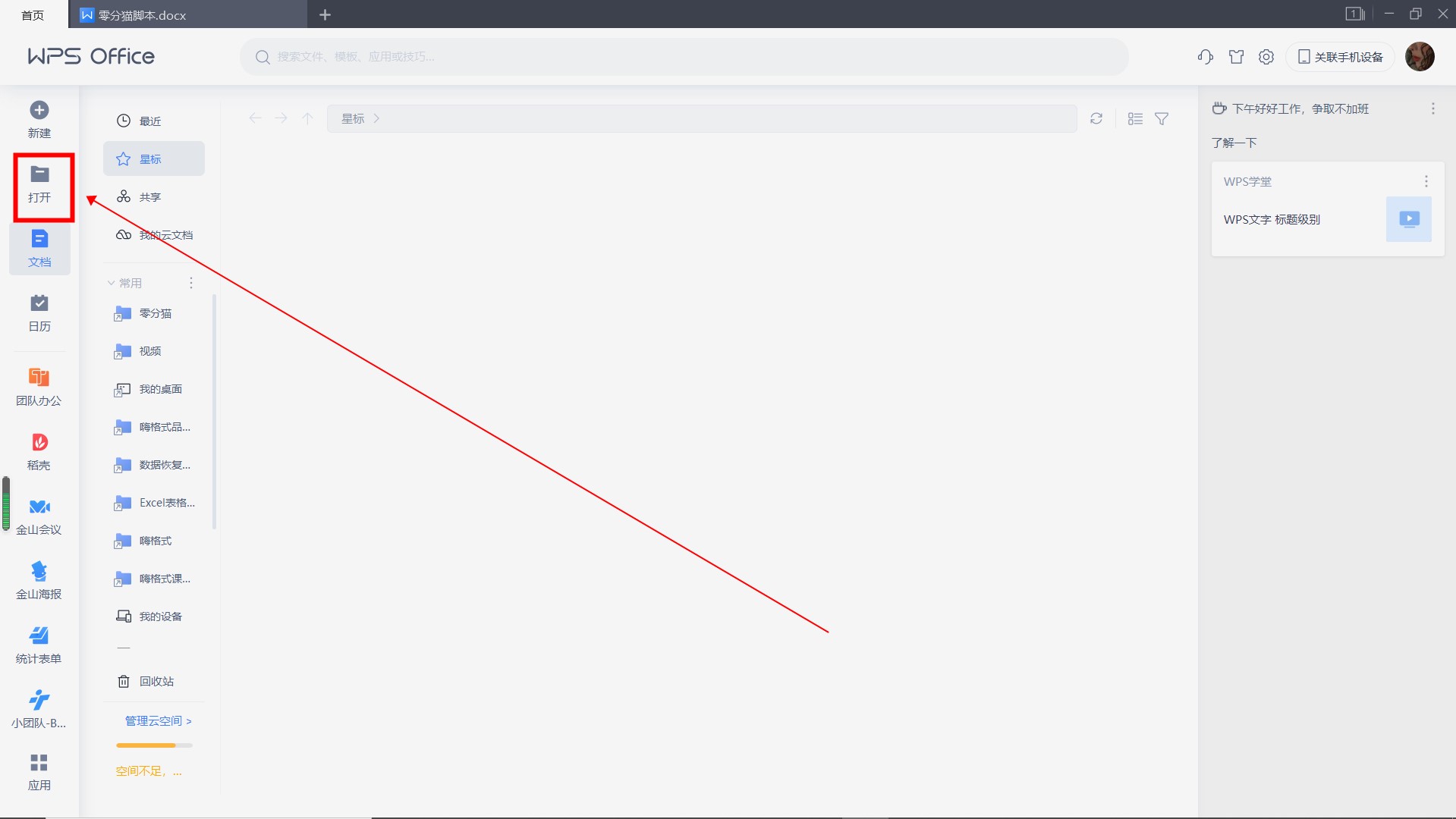 打开WPS软件,点击左边的“打开”。