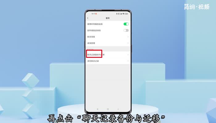 2.在设置界面,点击“聊天”选项进入聊天界面,然后点击“聊天记录备份和迁移”;