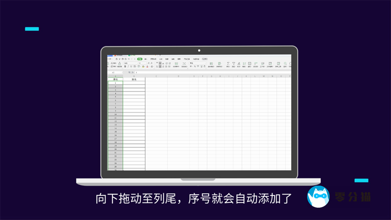 然后将鼠标指针指向方框选择区域的右下角。当鼠标变成十字时,按住左键向下拖动到列尾,序号会自动添加。