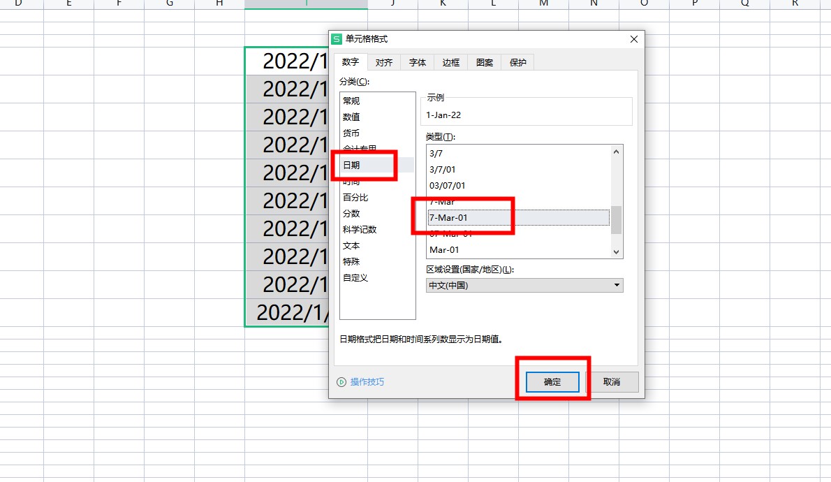 在单元格格式中,选择“日期”类别,然后单击“7-Mar-01”作为日期类型。