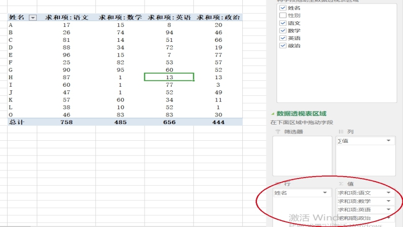 2.单击“确定”创建数据透视表。在新建透视表对话框中,拖拽行作为名称,拖拽值作为结果,即可得到对应的数据求和项。