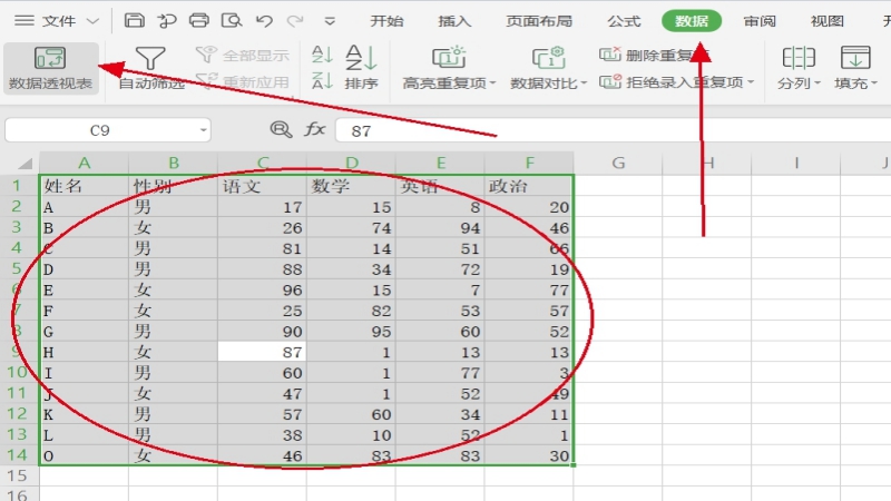 1.打开相应的数据表,选择导航顶部的“数据”和“数据透视表”选项。