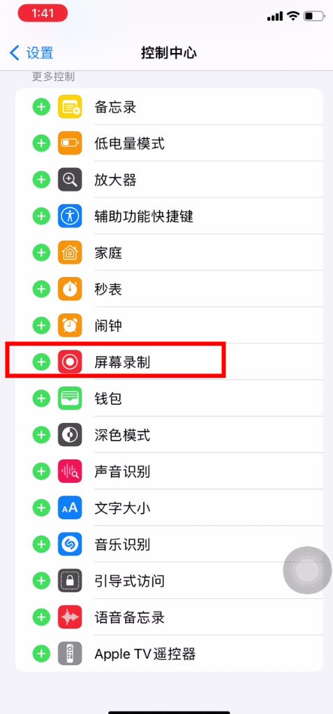 在控制中心界面中,下拉找到“屏幕录制”,点击它前面的“”。