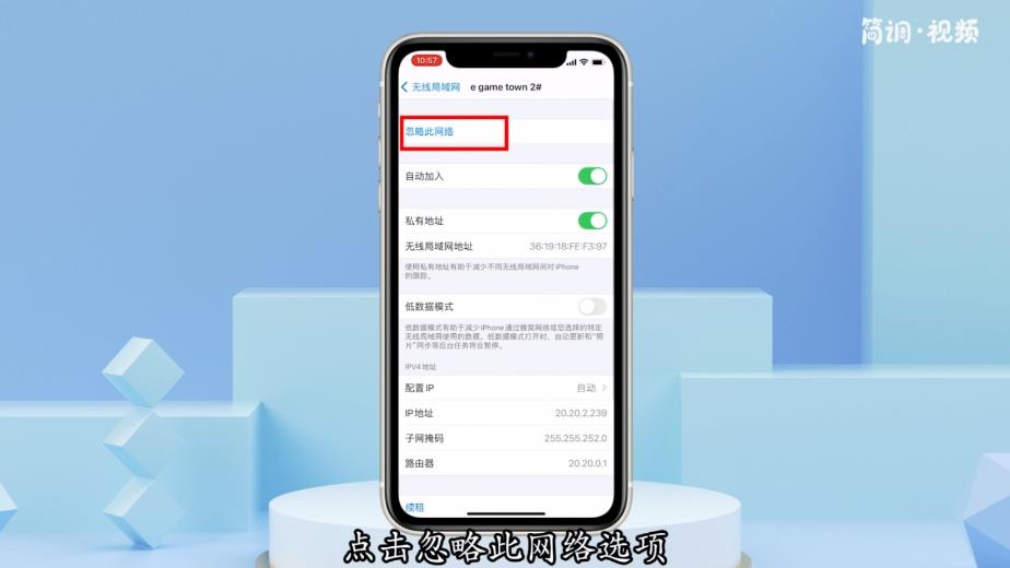 3.进入已连接网络页面后,点击忽略此网络选项;然后点击弹出窗口中的忽略选项;