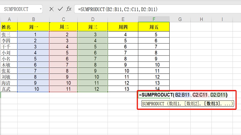 sumproduct函数中的参数为三个数组时,三个数组的所有元素都相应相乘。