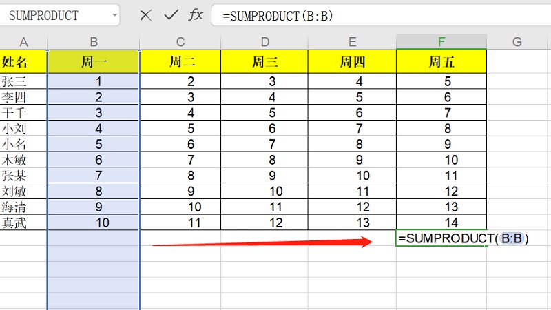 当sumproduct函数中只有一个参数数组时,数组B被求和,1 2 3 4 5 6 7 8 9 10=55。