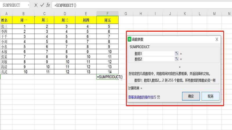 当sumproduct函数中的参数是两个数组时,两个数组的所有元素都相应相乘。