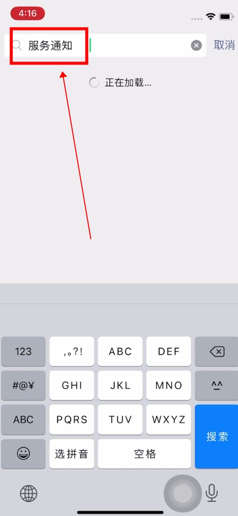 首先打开微信,点击上面的搜索,在搜索中输入“服务通知”。
