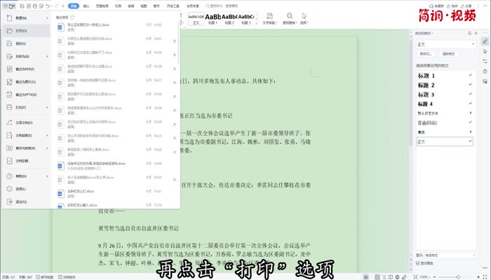 2.打开文档后,点击菜单栏中的“文件”选项,再点击“打印”选项,进入打印界面;
