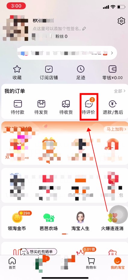 打开淘宝,进入我的淘宝,点击顶部“待评价”。