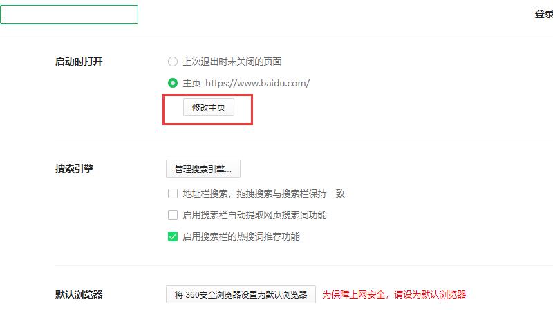 进入设置页面后,点击启动窗口中的“修改主页”选项。